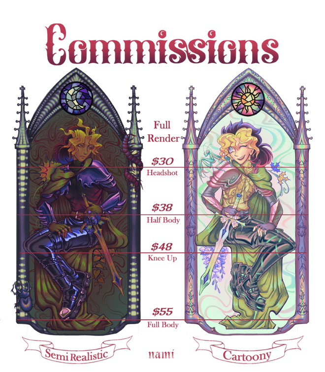 • Payment in 2 installments are available from a $120 order. One will be required before I start working on it, one after I have sent the client the sketch of their commission and after it has been validated.